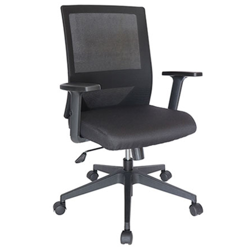 Silla operativa diseñada para jornadas completas de trabajo. Respaldo con diseño ergonómico tapizado en malla. Asiento acojinado con densidad de 35 kgs/m3 y alta resistencia tapizado en tela color negro. Brazos ajustables de polipropileno semi regido con pad de poliuretano de 7 posiciones. Mecanismo ejecutivo para ajuste de altura por medio de pistón neumático y reclinamiento con bloqueo. Perilla para ajuste de tensión. Base de poliamida con 5 rodajas.