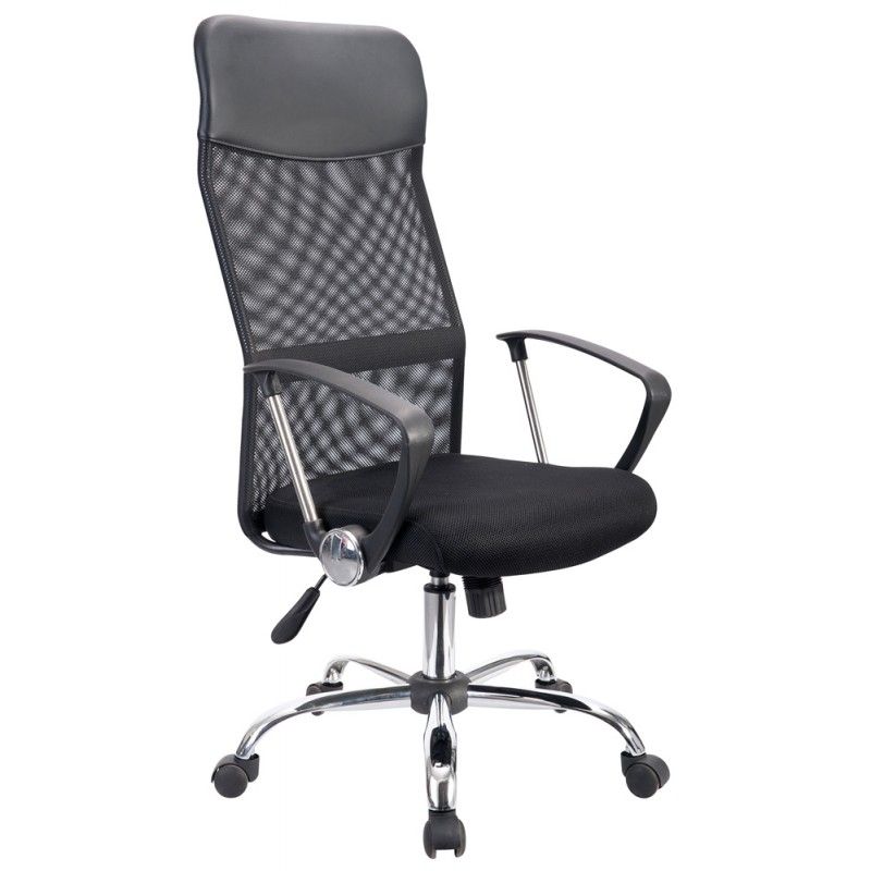 Sillón ejecutivo con respaldo alto tapizado en malla color negro. Asiento de hule espuma laminada flexible con densidad de 24 kgs/m³ y tapizado en tela microespacial color negro. Brazos de polipropileno rígido con soporte de acero. Mecanismo ejecutivo de plato de acero reforzado con pistón neumático para ajuste de altura y reclinamiento con bloqueo. Perilla para ajuste de tensión. Base de poliamida con 5 rodajas dual.