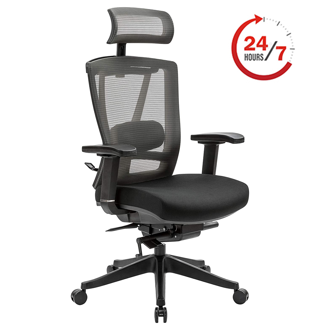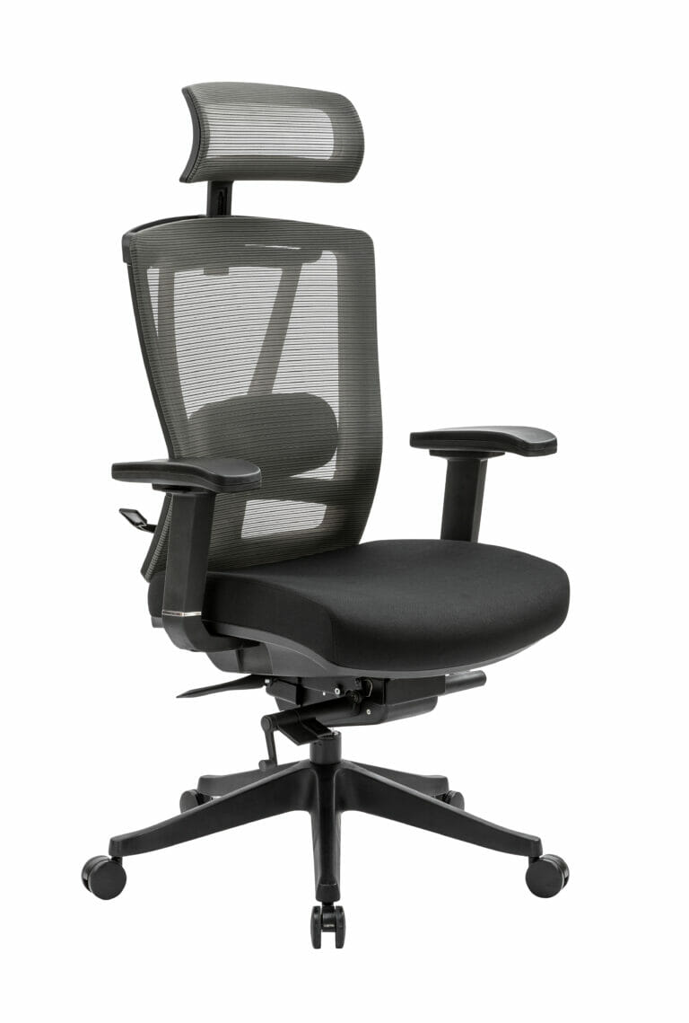 Sillón heavy duty de alto rendimiento para cuarto de control 24/7, respaldo y cabecera tapizados en malla color gris. Asiento tapizado en tela color negro. Brazos ajustables. Mecanismo para ajuste de altura y reclinamiento.